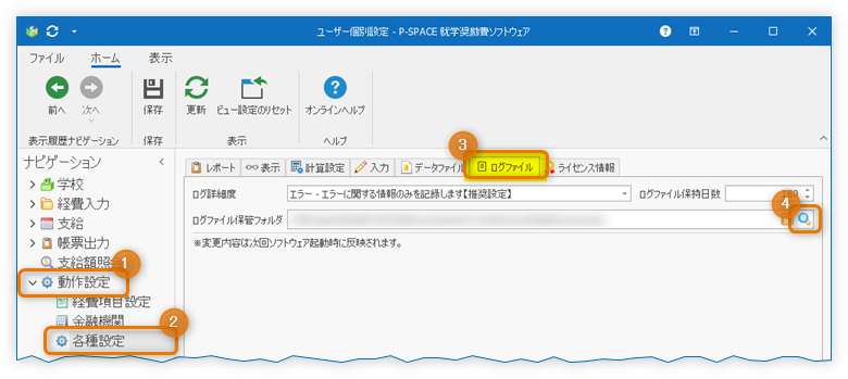 - その後、世帯構成員の入力を進めるうちに お問い合わせのエラーが発生しましたら、「動作設定」「各種設定」「ログファイル」タブの順にクリックし、「ログファイル保管フォルダ」欄の右端にある虫眼鏡ボタンをクリックしてください
