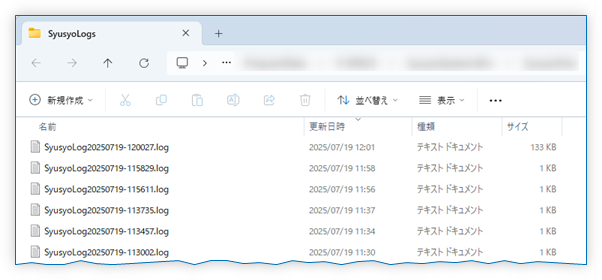 例えばあるログファイルのファイル名が「SyusyoLog20250722-142400.log」となっている場合、「20250722-142400」の部分がログファイルの日時(この例では「2025年7月22日 14時24分00秒」)になります。
